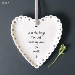 “Porcelain Scallop Hanging Heart – Of All The Things I’ve Lost I Miss My Mind The Most” has been added to your basket.
